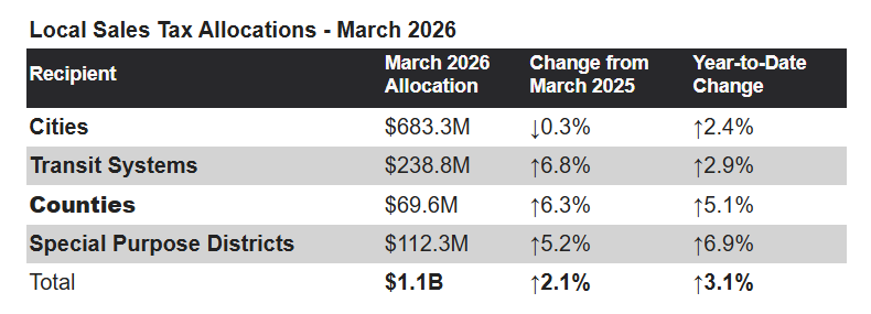 AUSTIN — Acting Texas Comptroller Kelly Hancock announced today he will send cities, counties, transit systems and special purpose districts $1.1 billion in local sales tax allocations for March, 2.1 percent more than in March 2025.