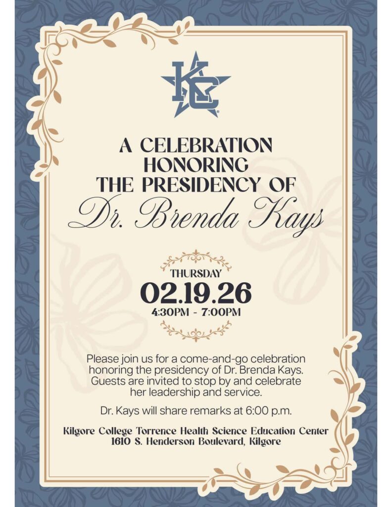 Kilgore College will host a come-and-go retirement celebration honoring the presidency of Dr. Brenda Kays on Thursday, Feb. 19, at the Torrence Health Science Education Center.
